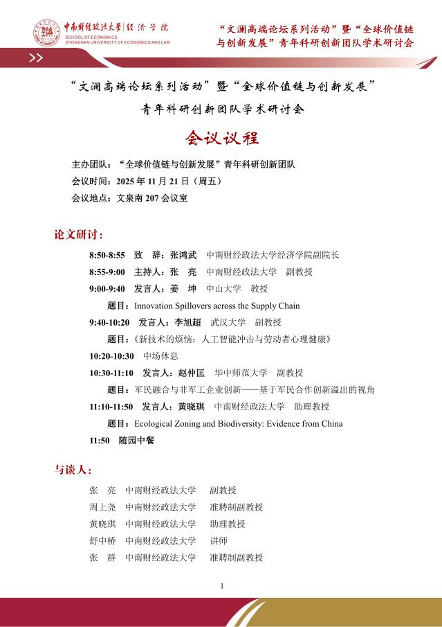 研讨议题:free entry, fake firms, and economic crime: an unintended consequence of registration deregulation研讨嘉宾:铁瑛上海财经大学商学院教授研讨时间:2025年11月20日(星期四)9:30~16:30研讨地点:文泉楼南207会议室嘉宾简介:铁瑛,上海财经大学商学院教授,入选中组部高层次青年人才计划。在《经济研究》《管理世界》《经济学(季刊)》《世界经济》等刊物发表论文,主持完成国家自然科学基金青年项目(特优)、教育部人文社科青年项目各一项,主持在研国家自然科学基金面上项目一项。主持人:宋丽智