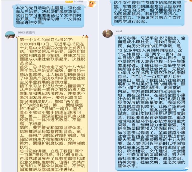 经济学专业本科生党支部通过线上通话的方式召开党日活动,重点学习《习近平在十九届中央纪委四次全会上发表重要讲话》《中国共产党第十九届中央纪律检查委员会第四次全体会议公报》《党委(党组)落实全面从严治党主体责任规定》《教育部召开 2020 年教育系统全面从严治党工作视频会议》《习近平:在决战决胜脱贫攻坚座谈会上的讲话》《习近平新时代中国特色社会主义思想三十讲:第十一讲》《关于持续解决困扰基层的形式主义问题为决胜全面建成小康社会提供坚强作风保证的通知》等文件,并进行了学习心得分享。