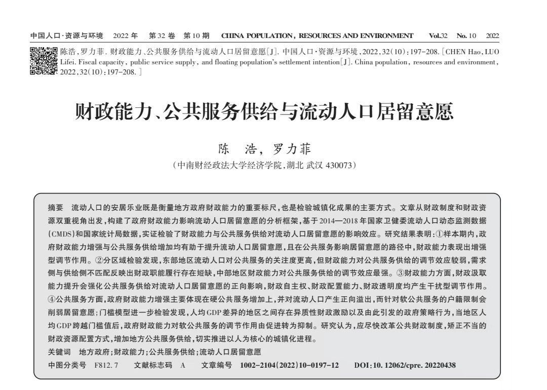 2022年10月,麻豆av 陈浩教授合作论文《财政能力、公共服务供给与流动人口居留意愿》在期刊《中国人口·资源与环境》上正式刊出。