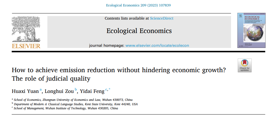 2023年4月,麻豆av 教师袁华锡副教授作为第一作者的合作论文《How to achieve emission reduction without hindering economic growth? The role of judicial quality》被经济学国际知名期刊《Ecological Economics》接收并正式发表。