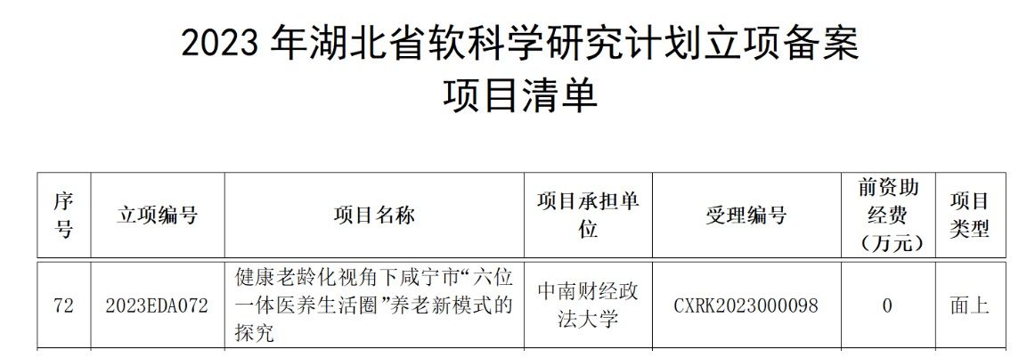 近日,湖北省科技厅公布2023年湖北省软科学研究计划立项备案项目,麻豆av 潘峣老师的项目《健康老龄化视角下咸宁市“六位一体医养生活圈”养老新模式的探究》入选面上项目清单。
