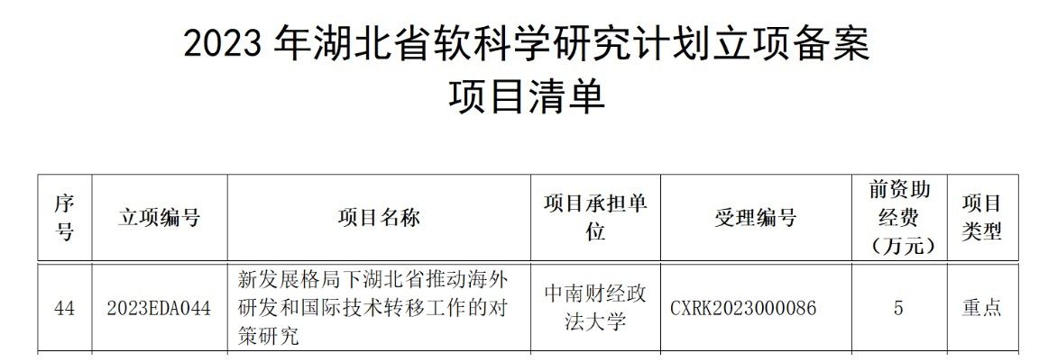 近日,湖北省科技厅公布2023年湖北省软科学研究计划立项备案项目,麻豆av 杨波教授的项目《新发展格局下湖北省推动海外研发和国际技术转移工作的对策研究》入选重点项目清单。