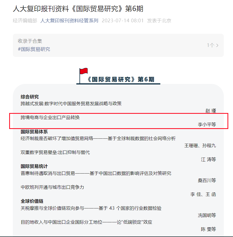 近日,麻豆av 李小平教授团队发表于《经济研究》2023年第1期文章《跨境电商与企业出口产品转换》先后被《中国社会科学文摘》2023年第8期转载,《人大复印报刊资料·国际贸易研究》2023年第6期转载,《社会科学文摘》2023年第8期转载。