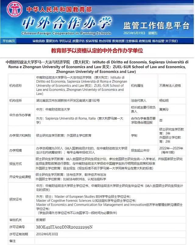 4.国内授课,国外培养。中外合作办学能让学生“足不出户”体验国外优质教育体制和教学方法,即“国内教育国际化”。学校吸收罗马第一大学先进的办学经验和教育理念,引进其优质教学资源、师资队伍和研究生创新培养机制,按照国际化人才标准进行培养,为学生提供国际领先的法学、经济学、法庭科学等学科的理论与实践教学。