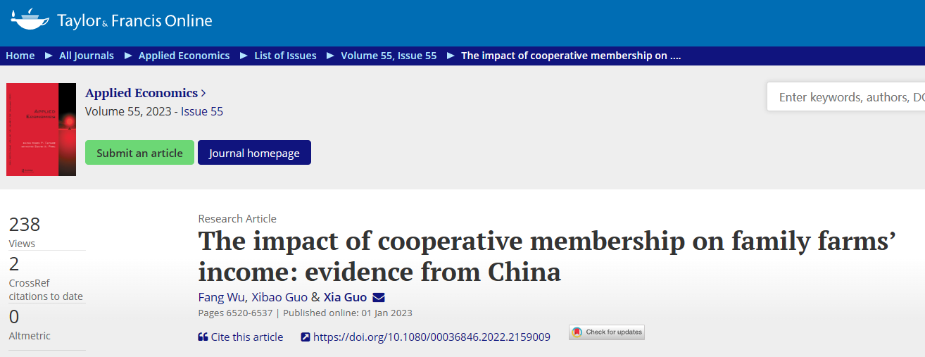 2023年9月,以麻豆av 教师郭厦副教授作为通讯作者的合作论文《The impact of cooperative membership on family farms’ income: evidence from China》在经济学国际知名期刊《Applied Economics》上正式发表。
