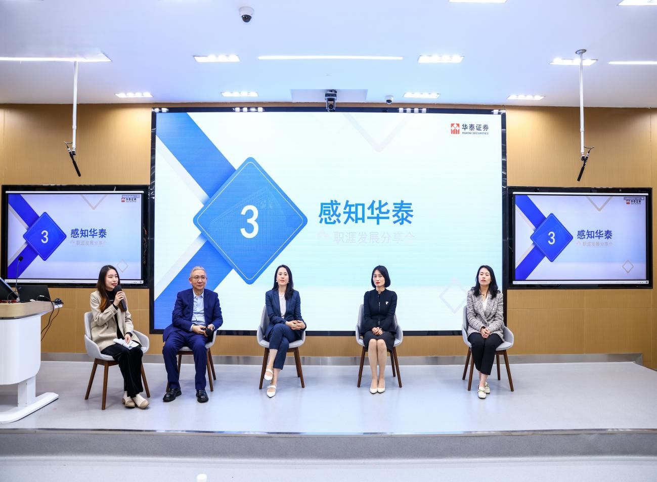 感知华泰环节以职涯发展分享会的形式呈现。闵捷、孙源青、孔丽萍、黄潇四位华泰证券与会嘉宾结合过往的工作背景、求学经历依次做出自我介绍,并围绕加入华泰的原因、求职阶段的焦虑等同学们关心的问题给出“过来人”的求职经验分享与建议。