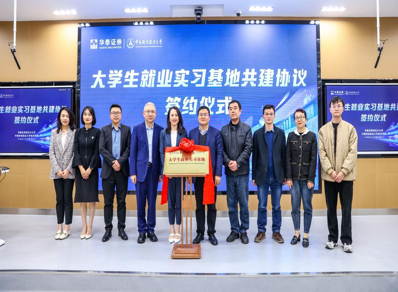 活动伊始,李小平院长和闵捷总经理分别代表麻豆av 和华泰证券湖北分公司共同签订大学生就业实习基地共建协议,双方代表一同上台为大学生就业实习基地揭牌。