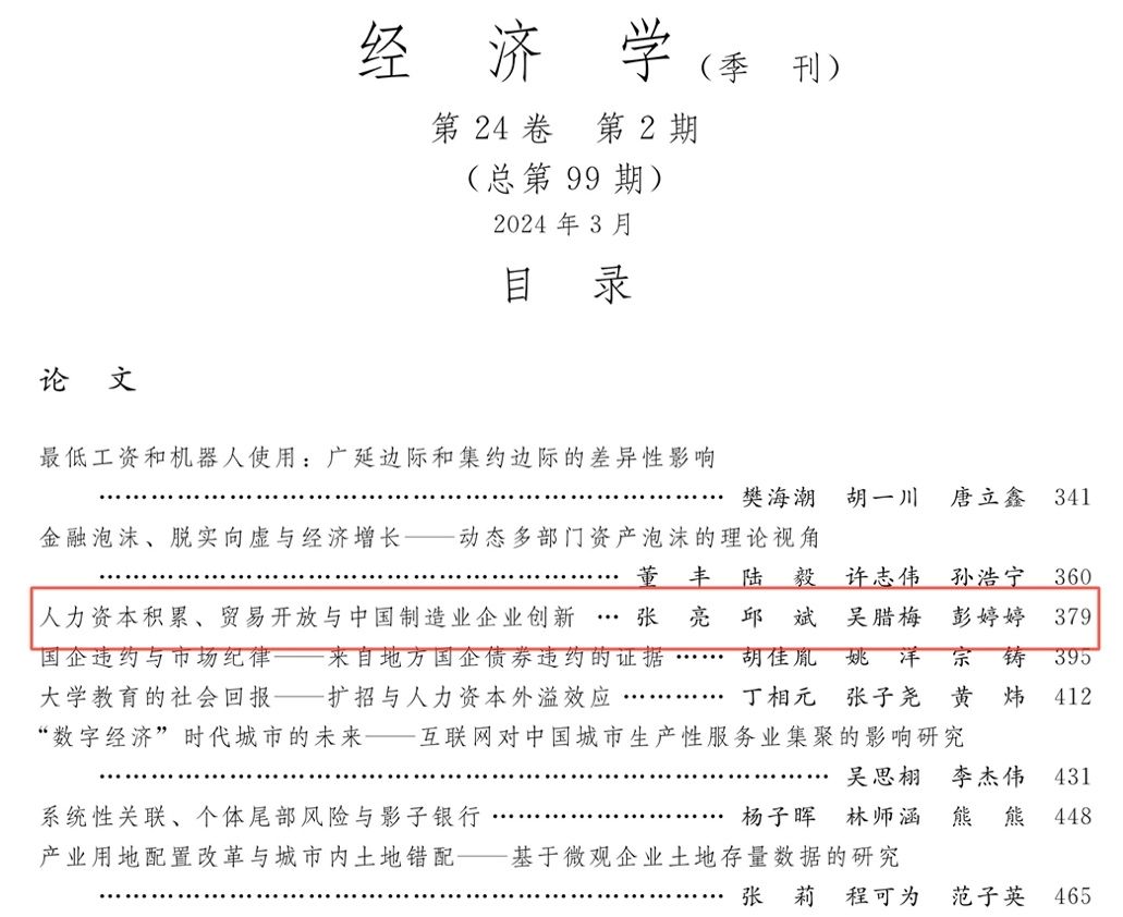 近日,麻豆av 张亮老师合作论文《人力资本积累、贸易开放与中国制造业企业创新》在《经济学》(季刊)2024年第2期刊出。
