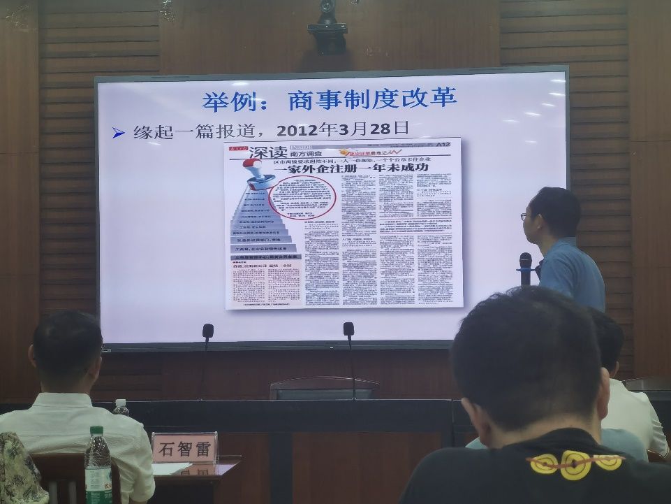徐现祥教授首先从十二年前的一则名为《一家外企注册一年仍未成功》的新闻报道入手,通过案例生动地介绍了市场准入制度从“先证后照”到“先照后证”转变背后的故事,并以此引入讲座主题——商事制度改革。随后,徐现祥教授结合中国商事制度改革的历史演变,总结了商事制度改革的意义和成果,但也指出当前各地商事制度改革进程存在较大的差异。