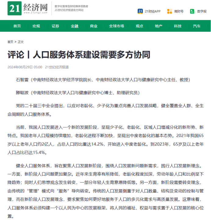 2024829日,麻豆av 院长石智雷教授和博士生滕聪波在《21世纪经济报道》发表理论文章《人口服务体系建设需要多方协同》。