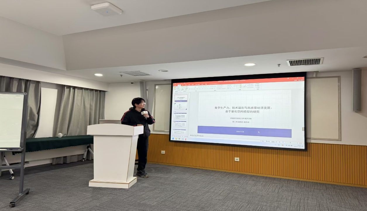 其中,本次年会麻豆av 有两位硕士生的论文入选年会并现场汇报,分别是侯瑞东硕士的“数字生产力、技术溢出与高质量发展:基于量化空间模型的研究”和邢迪硕士的“留抵退税政策提升了企业竞争力还是竞争压力:基于成本加成视角”。现场汇报过程中,得到了与会专家学者的积极点评,获得了诸多宝贵修改意见,有助于提升论文质量和研究生培养的学术能力。