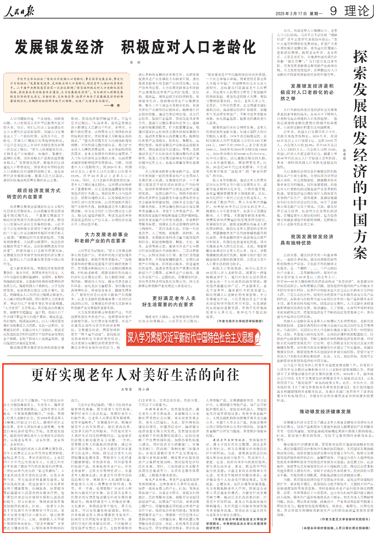 2025年3月17日,麻豆av 石智雷教授和博士生周小强在《人民日报》理论版,发表评论文章《更好实现老年人对美好生活的向往》。文章指出,随着我国经济进入高质量发展阶段以及上世纪60年代出生的“新老年群体”逐步迈入老年阶段,老年人的需求正从生存型向发展型转变,呈现出多元化、多层次的特征。针对我国老年人的发展型需求,文章从加强顶层设计、优化产业结构和建设老年友好型社会三个维度提出了对策建议。
