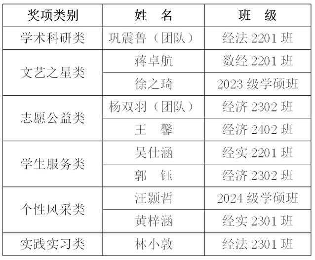 2024-2025学年“经英中南”之十佳青年(团队)名单最终确认,现予以公示: