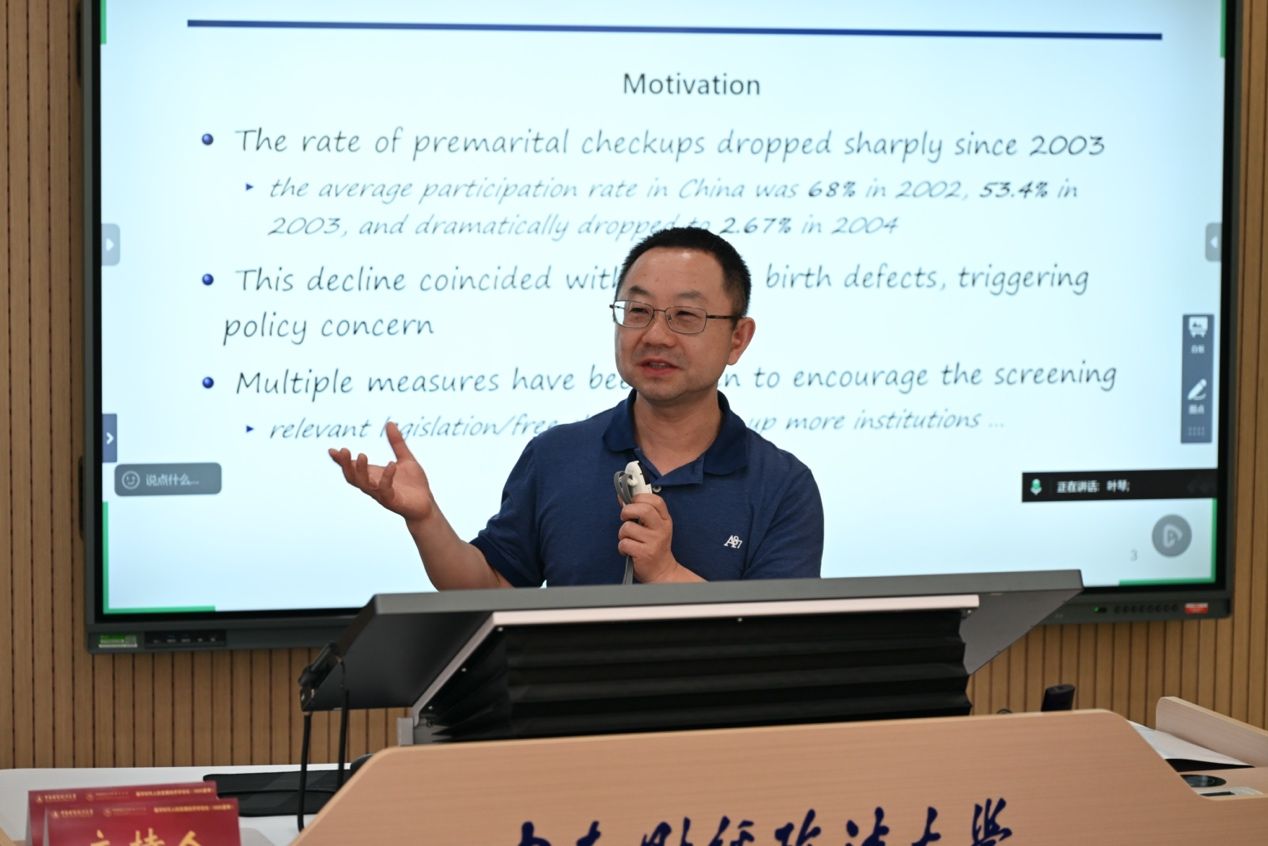 随后,武汉大学傅十和教授以《Does Free Premarital Health Examination Improve Birth Outcome? Evidence from China》为题作了学术报告。傅教授的研究利用2004年至2014年江苏省县级免费自愿婚前医学检查政策的交错实施,采用双向固定效应和事件研究设计,严谨评估了该政策对婴儿死亡率、出生缺陷率和低出生体重率的影响,并从成本收益视角强调了政策推广的经济与社会效益。嘉宾们还深入探讨了婚检数据真实性、婚检实施机制及政策长期效应的评估问题。讨论环节,石智雷院长、陈媛媛教授、刘玲博士等就政策的累积效应评估、数据来源的准确性、婚检参与率的解读以及效应大小的实际意义等与傅教授展开了热烈而深入的讨论。