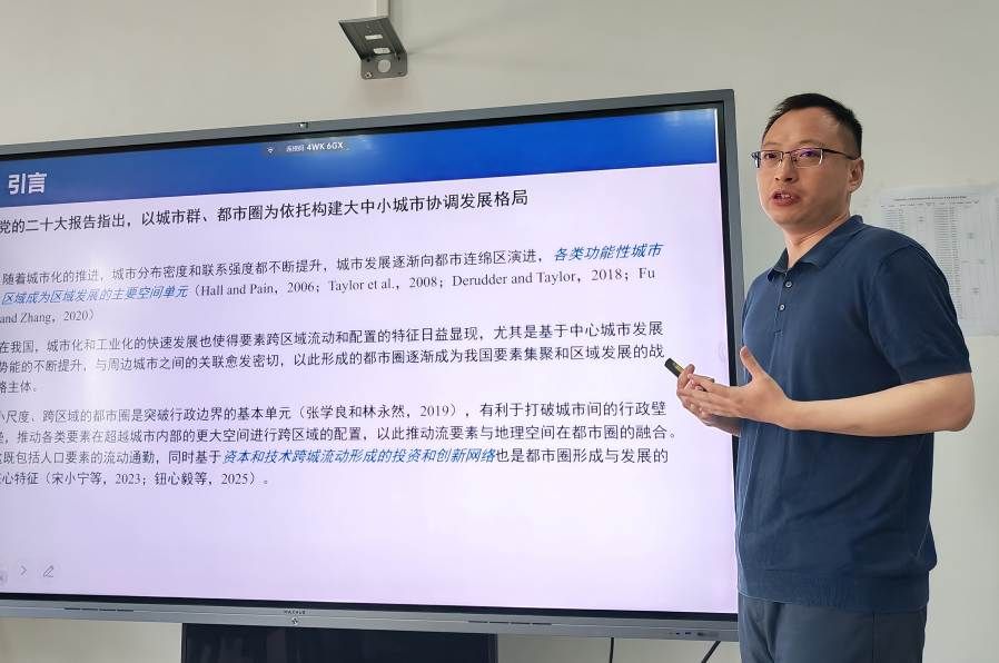 接着,上海社科院李培鑫副研究员以《都市圈异地投资和创新合作网络有利于促进绿色发展吗》为题作了学术报告。面对日益严峻的污染排放,跨区域都市圈的发展为污染排放提供了新的解决路径。李培鑫副研究员基于异地投资和专利联合申请的数据刻画都市圈各城市间发生的实际经济关联,分析其对推动污染减排的影响,从改善企业资源配置与生产效率、推动产业数字化转型等方面对相关作用机制与路径进行展开论述和检验,对都市圈中心城市与非中心城市之间、产业关联与创新合作之间的相互关系与协同作用进行了识别。最终得出了相应的研究结论与启示。交流环节中,与会师生针对都市圈的政策与经济识别异质性问题、都市圈发展中的城市转型问题、都市圈发展的虹吸与溢出效应问题、都市圈发展产生的外部性以及外部性内部化问题等展开了激烈的讨论。