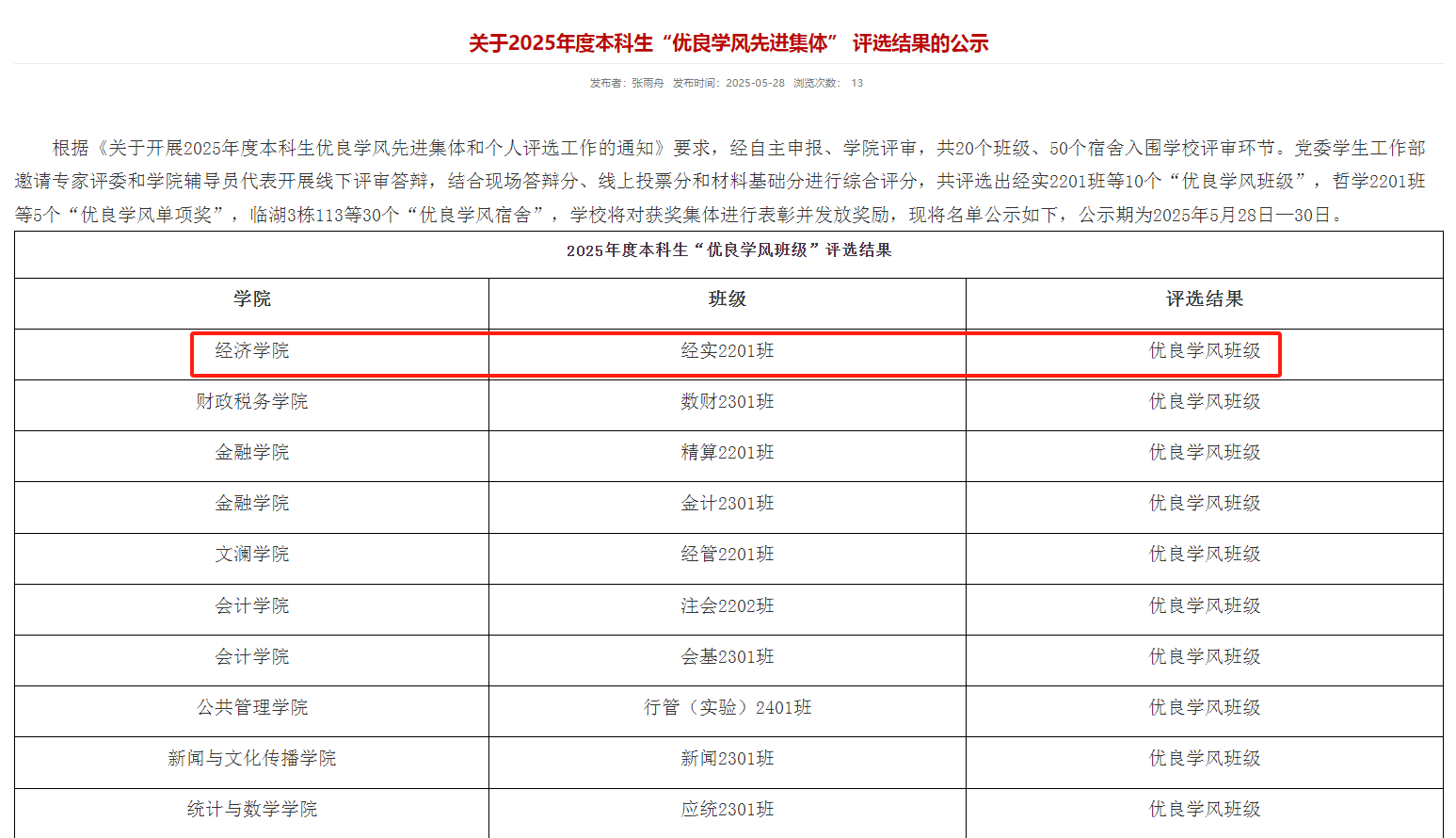 经(实验)2201班在学院初评阶段便以亮眼数据脱颖而出:前五学期加权平均成绩人均88.18分,稳居年级第一;英语四级通过率100%,六级通过率73%;体测合格率100%,奖学金覆盖率达70%,其中国家奖学金2人、国家励志奖学金1人;班级成员累计参与国家级、省级、校级科研项目十余项,在“博文杯”“明理杯”等竞赛中斩获佳绩,展现扎实的专业素养。