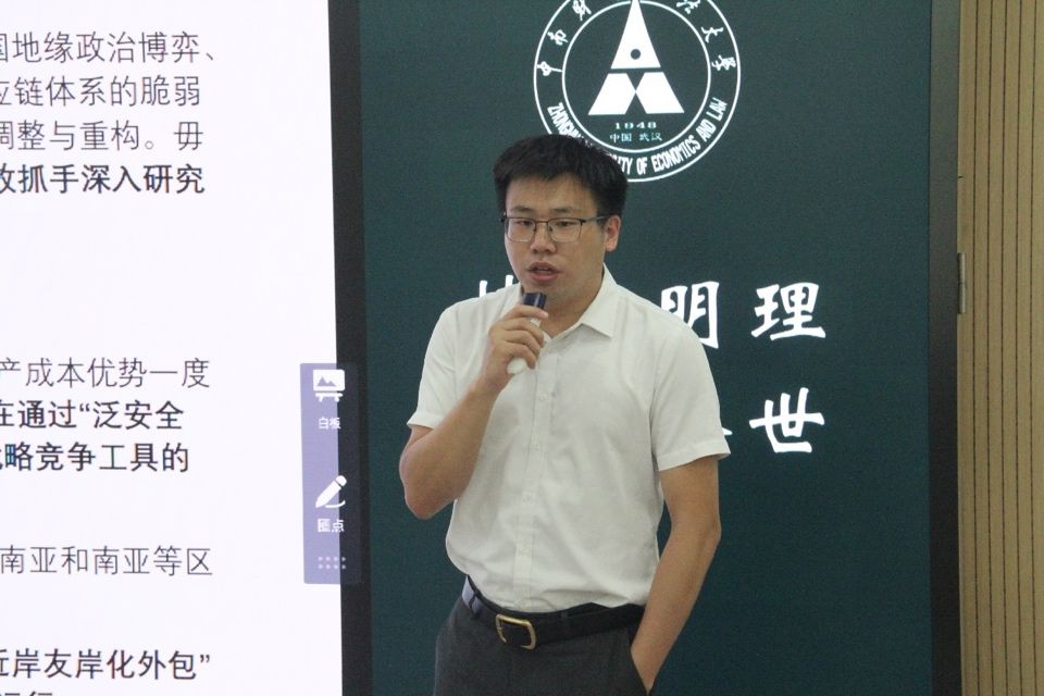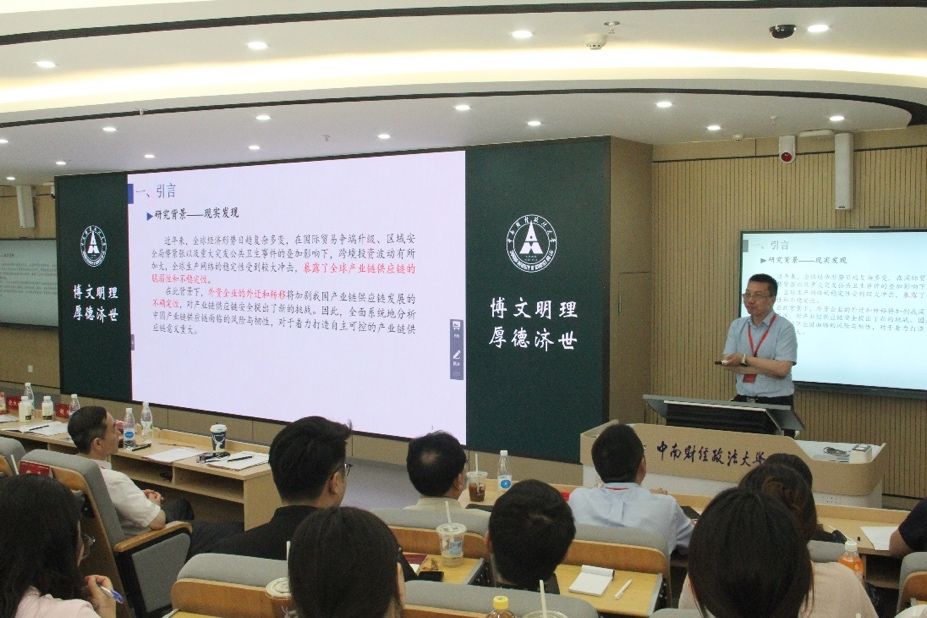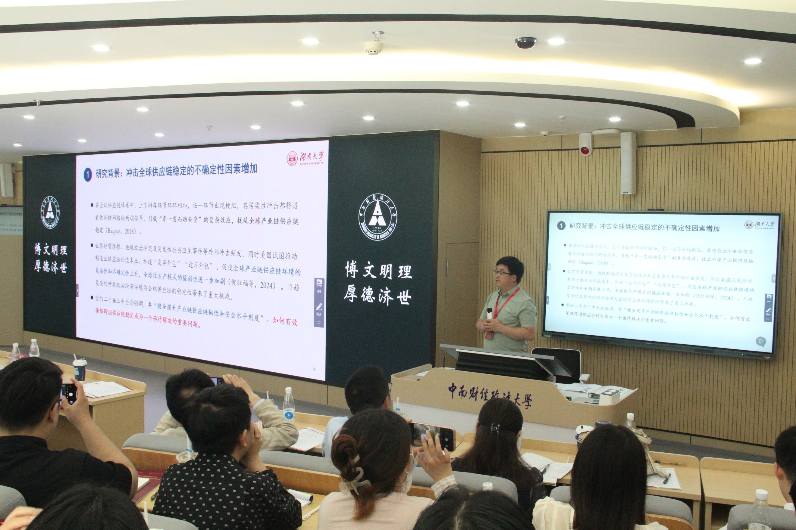 最后,湖南大学谢锐教授分享了题为《自由贸易协定深化与跨国供应链稳定》的报告。谢锐教授首先指出,国际经贸规则对全球供应链调整具有重要影响,但WTO框架下的国际经贸规则更新滞后,治理体系难以取得突破性进展,当前各国经贸合作的议题范围逐步向“边境后”规则拓展,从而提出自由贸易协定深化如何影响跨国供应链稳定这一关键问题。接着,谢教授详细介绍了研究设计、指标设计和数据来源,通过实证检验发现FTA深化通过降低成员国间的贸易政策不确定性、缩小成员国间的制度距离、降低跨国供应链信息搜寻成本等渠道提升跨国供应链稳定,且更能显著提高非三大区域供应链、国际政治倾向相近成员国间供应链的稳定性。在交流环节,与会师生对指标构建、内生性、异质性检验等问题展开了热烈的讨论。