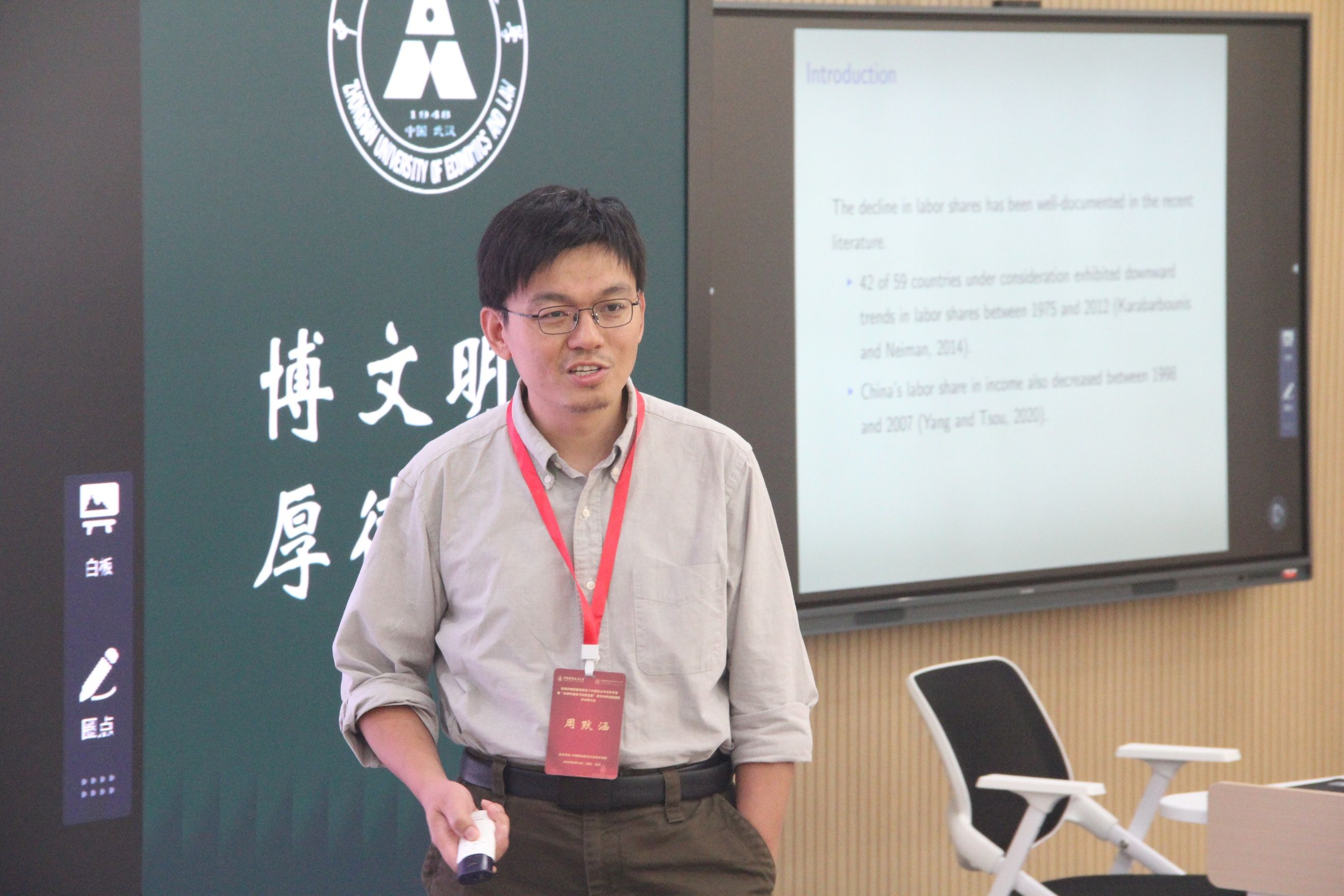 随后,浙江大学周默涵副教授分享了题为《Input Trade Liberalization and Labor Share》的报告。周默涵副教授首先指出,当前研究表明无论是世界范围还是中国,都呈现劳动份额下降的趋势,接着,周默涵副教授介绍了一些可能的解释,例如新古典主义解释,产品市场垄断势力上升, 劳动力市场单一垄断势力,超级明星企业或资源再分配,基于任务模型的自动化等。基于此,周默涵副教授提出了自己的核心猜想,即全球化是否导致劳动收入份额下降?随后,周默涵副教授介绍了理论分解框架并基于数据进行了检验,发现进口关税自由化对劳动份额的总体影响是正向的,其中超过一半的效应可以通过中间投入与初级投入之间的替代关系来解释。在交流环节,与会师生对理论分解框架、指标解释等问题展开了热烈的讨论。