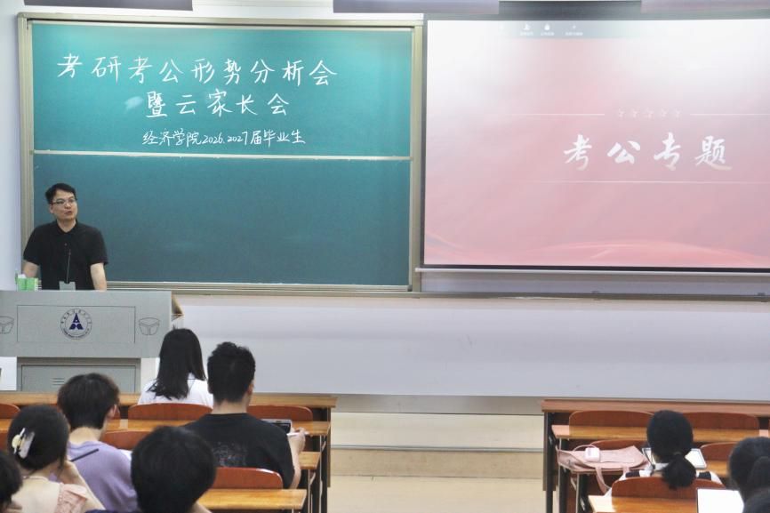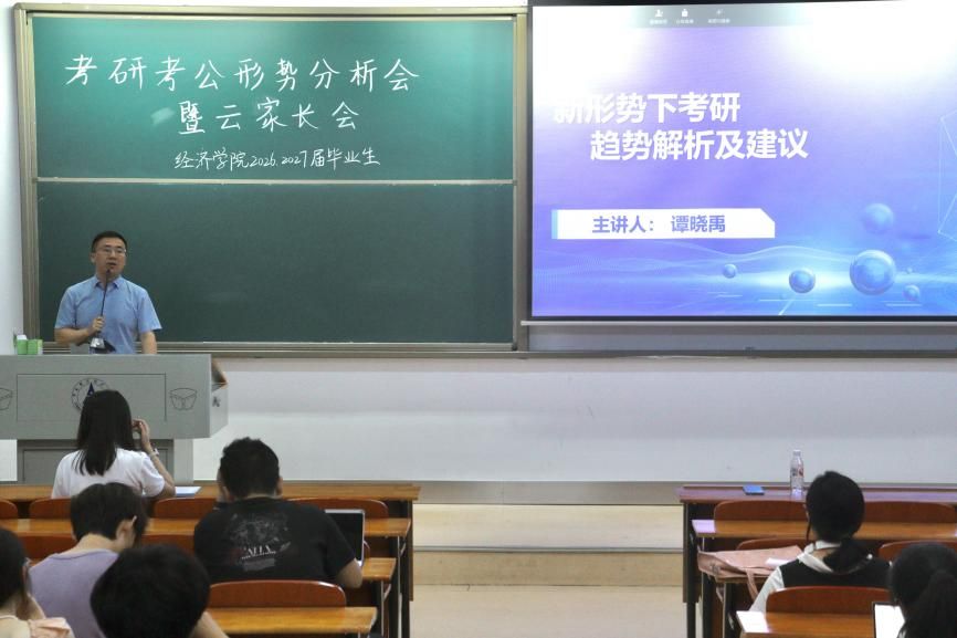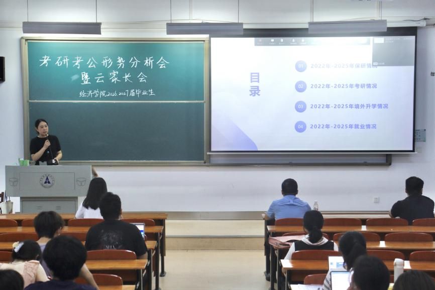 (学生通讯员 高枫博 摄影 段雨庭)为助力2026、2027届毕业生精准把握考研考公形势,科学规划职业发展路径,凝聚家校育人合力,麻豆av 于2025年6月10日19:00在南附楼201召开了考研考公形势分析会暨云家长会。2026届本科毕业生辅导员周琼老师及考研、考公相关专家老师出席会议,2026、2027届本科毕业生家长线上参会,2027届毕业生线下参会。2027届本科毕业生辅导员包伦娜老师主持会议。