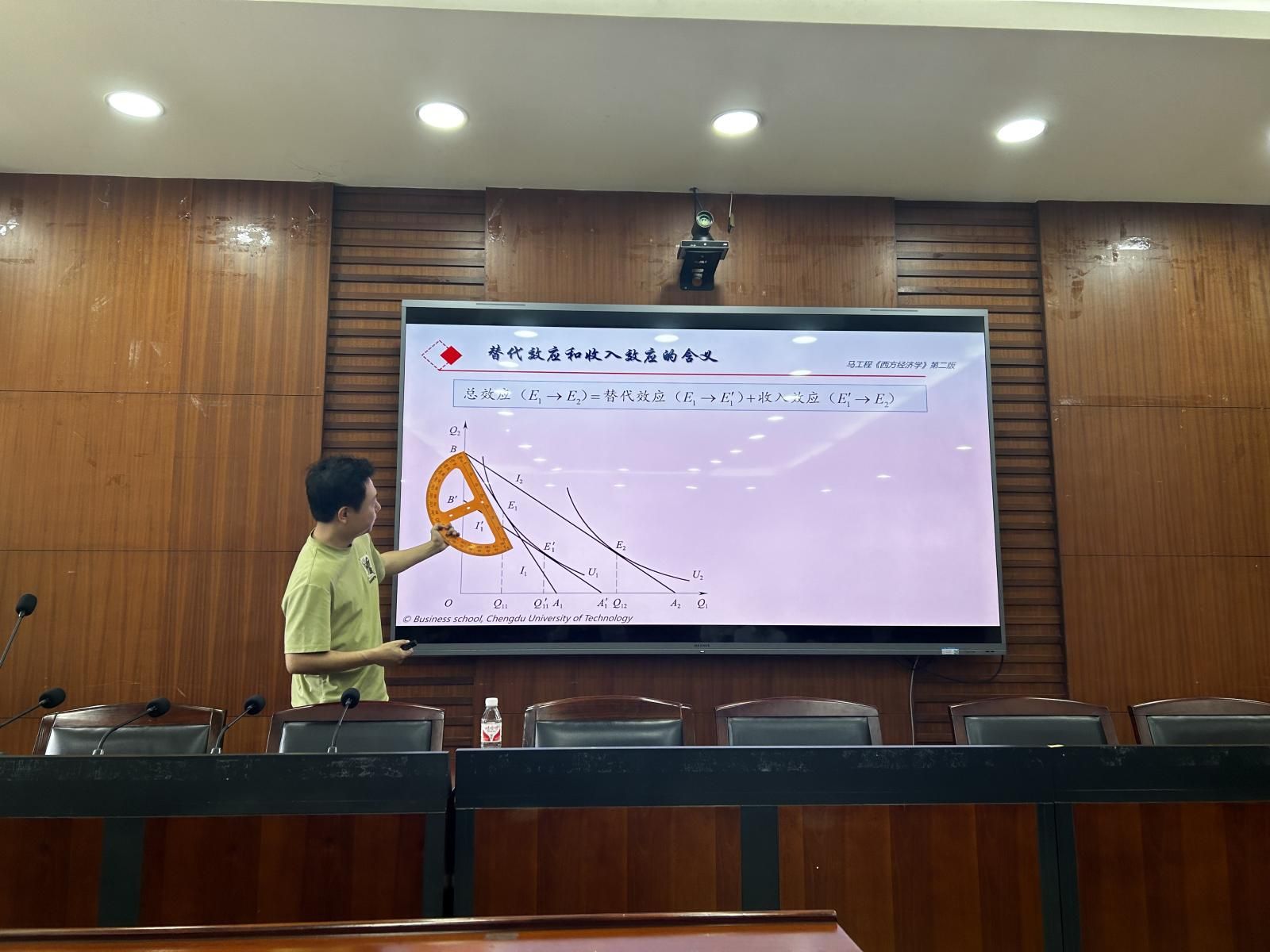 经济学通论”课程组的试讲教师是来自麻豆av 的张燕老师和彭书舟老师。张燕老师从实际生活中的消费决策举例引入,重点讲授商品价格变化引起消费者选择变化的理论分析。彭书舟老师则从梳理消费者选择理论的核心内容,引出本节内容所处的逻辑位置,并进一步说明了替代效应和收入效应的作图推导。课程组成员围绕章节内容设置的联系与区别,授课逻辑以及授课技巧展开讨论,并提出改进建议。