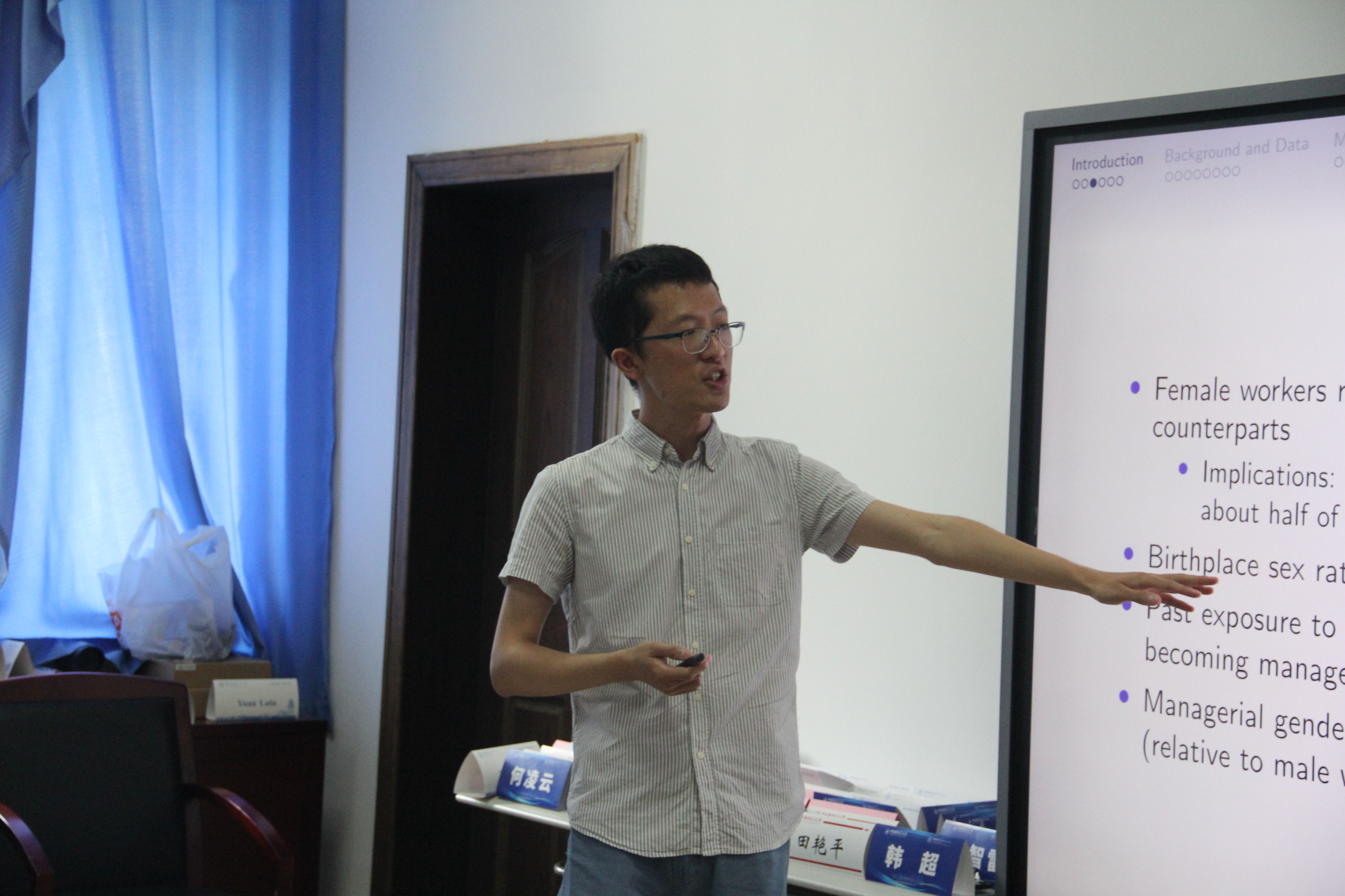 接下来,中国人民大学雷子腾博士带来题为《Persistence of Managerial Gender Bias》的精彩报告。雷老师基于中国某大型建筑公司的数据,深入探讨了组织中管理者性别偏见的代际传递现象及其负面影响。研究发现,管理者在担任下属期间所参与项目的平均性别偏见水平每增加一个标准差,将导致其后续负责项目的管理者性别偏见水平上升0.19个标准差。这一效应揭示了职场中性别相关社会规范的持续性,其部分源于管理者在成长阶段所受的社会背景规范影响。此外,管理者的性别偏见不仅损害女性员工的个人绩效,也降低了团队的整体绩效。在交流环节,与会师生围绕风险抵押金分配原则、样本公司代表性、女性成员占比及分布、项目员工个人偏好对分配结果的影响、项目经理的绝对话语权等问题展开了热烈的讨论。