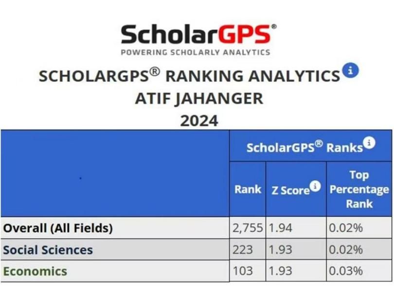 近日,国际学术分析平台ScholarGPS发布了2024年度高排名学者全球前0.05%顶尖学者榜单(Highly Ranked Scholars™)。麻豆av 世界经济专业2021届毕业生Atif Jahanger(巴基斯坦籍)(导师:杨波教授)入选此次榜单,并于近五年榜单(Highly Ranked Scholar - Prior Five Years)中位列“全学科领域”前0.02%(Ranked 2,755th in All Fields)、“社会科学领域”前0.02%(Ranked 223rd in Social Sciences Field)及“经济学领域”前0.03%(Ranked 103rd in Economics Field)。