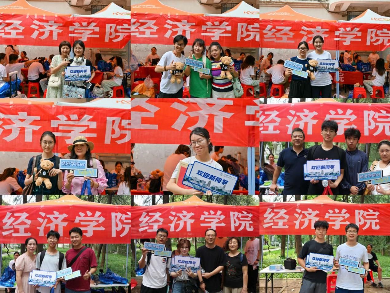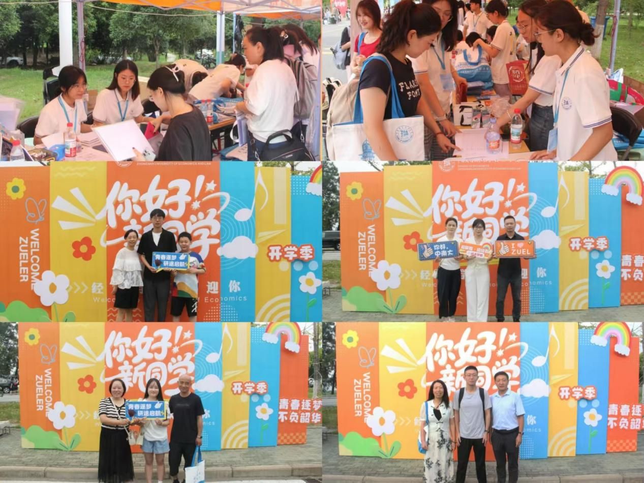 (迎新志愿者开展报到工作、部分新生和家长与迎新展板合影留念)