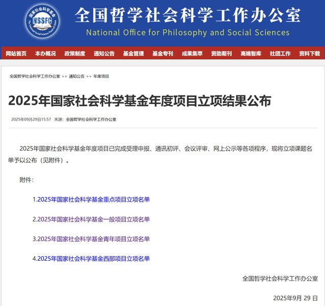 2025年9月 29日全国哲学社会科学工作办公室发布了《2025年国家社会科学基金年度项目立项结果公布》的通知。