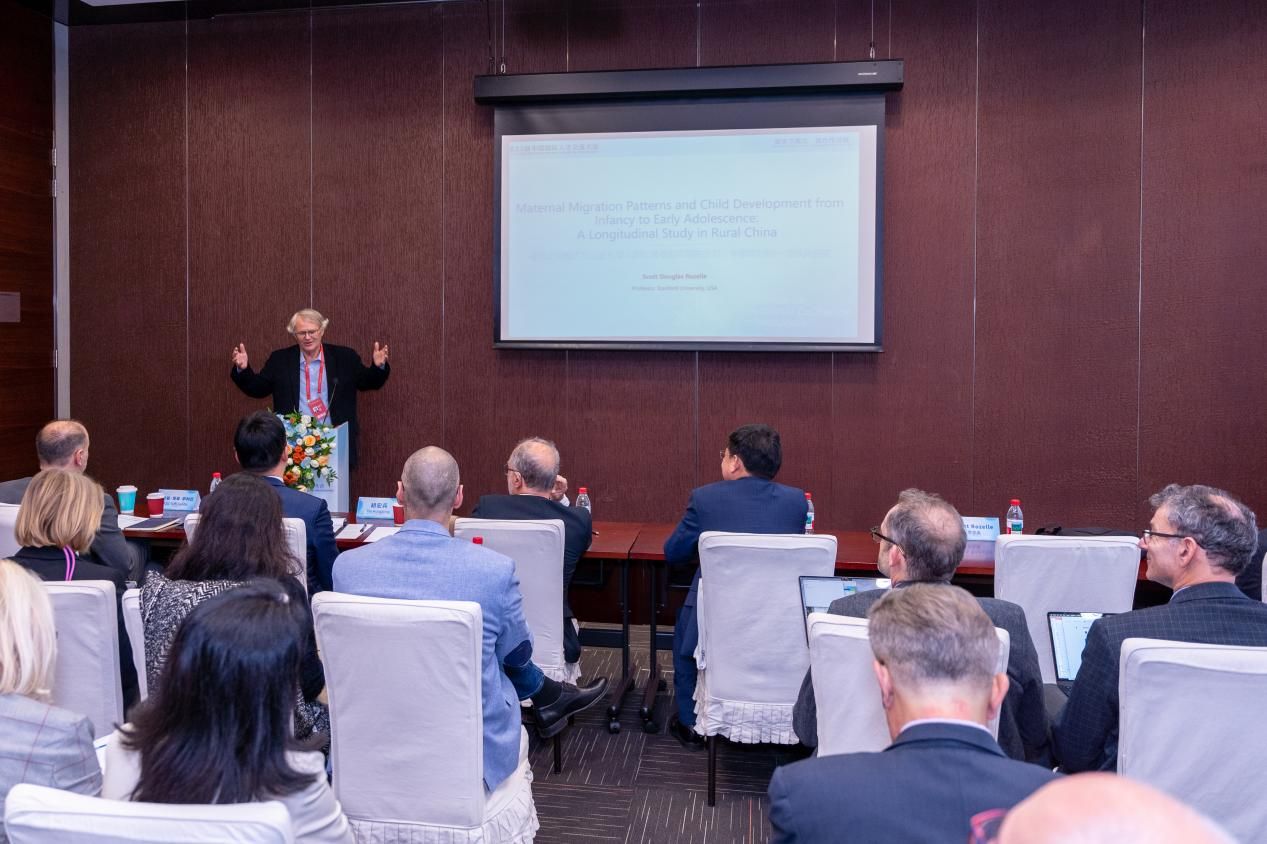 在特邀发言环节,麻豆av 邀请中国政府友谊奖获得者、新中国成立70周年纪念勋章获得者、斯坦福大学教授Scott Rozelle带来题为”Development from Infancy to Early Adolescence: a Longitudinal Study in Rural China”的主旨演讲,深入解读在中国农村地区母亲的迁移模式对留守儿童早期发展的影响研究,演讲指出中国农村人力资本挑战大,农村儿童认知、语言等发育迟缓率高,即便有教育投入,城乡成绩差距仍大。研究显示25%~50%农村母亲外出务工,其持续迁移对留守儿童认知发展、BMI有显著负面影响且具有长期性。
